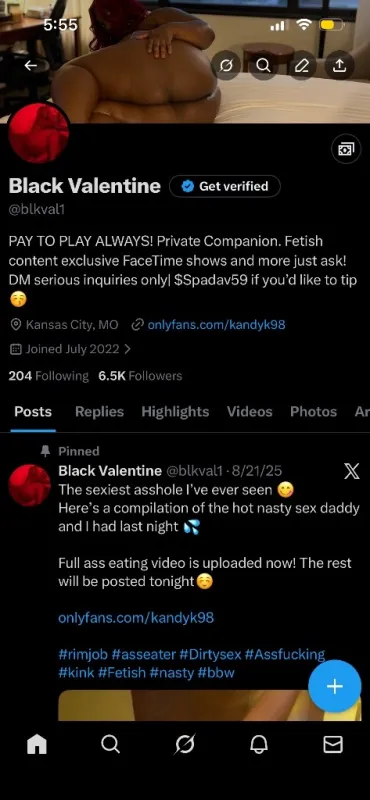 ๐ซ NOT CHEAP. NOT FREE. NO EXCHANGES. NO RAW SEX. ๐ซ The experience is whatever you make of it, but I guarantee you'll be thanking me when I'm done. Serious, respectful, clean men only. Do not call multiple times if I donโt answer the first time โ I will get back to you. Be mindful of the time when calling Fetish-friendly ๐ | Ass-eater ๐ | Sensual massages ๐๐ฝโ | Anal available ๐ฅ Incall, outcall, and much moreโฆ just ask ๐๐ฆ My Twitter speaks for itself that's your verification. Do your own research ๐ Twitter: @blkval1 ๐ OnlyFans: @blkval