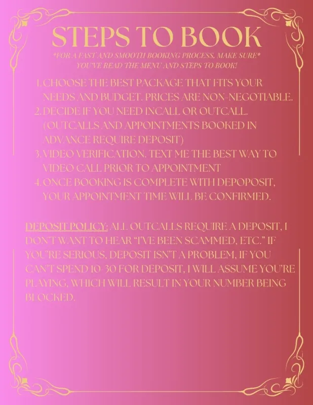 Outcalls REQUIRE a deposit (This lets me know you're serious and not wasting my time) No AA NO BARE (dont ask) No time wasters No lowballers (if you try negotiating prices you'll be denied from booking) No police No pimps